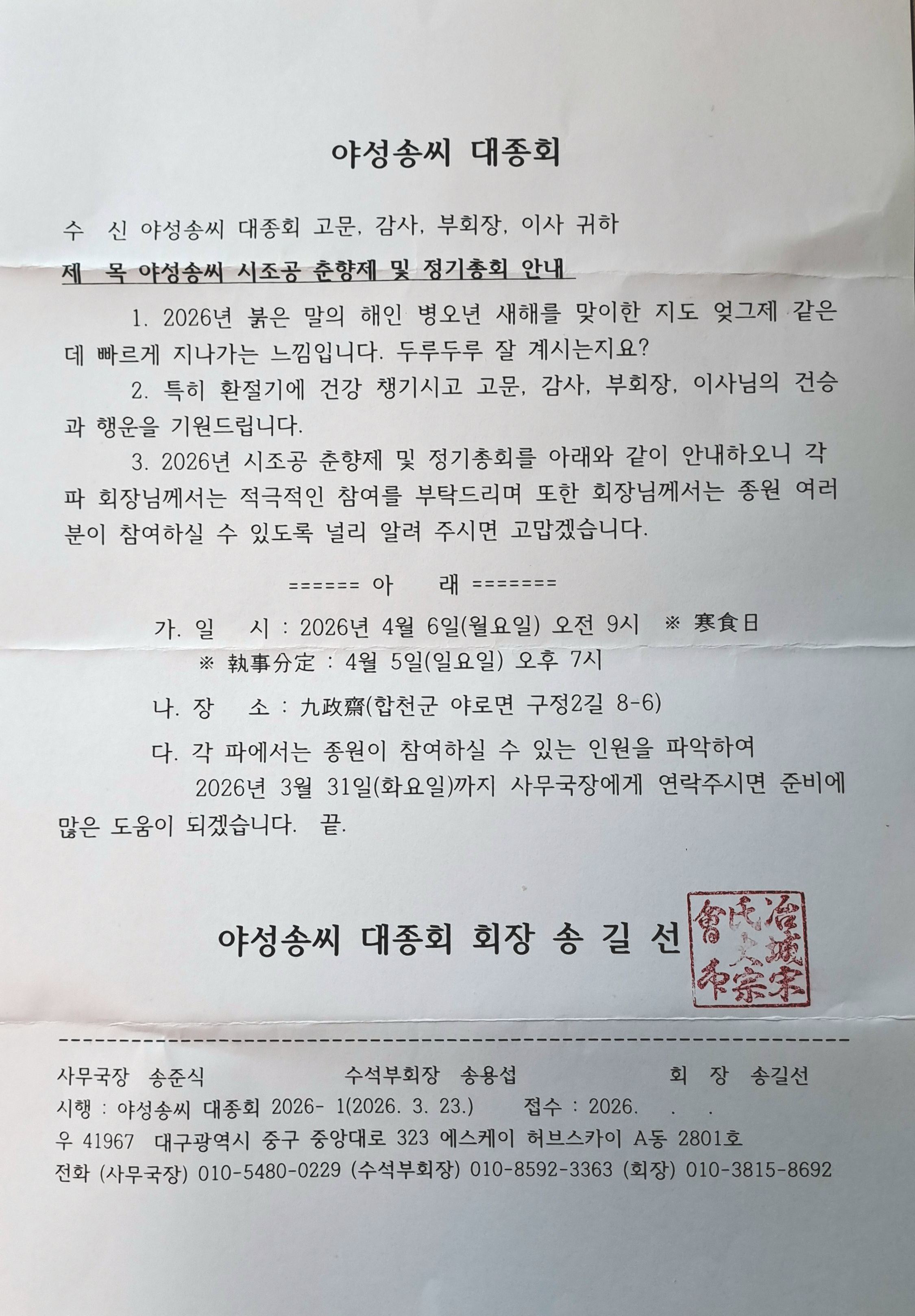 2026년, 야성송씨 시조공 춘향제 및 정기총회안내